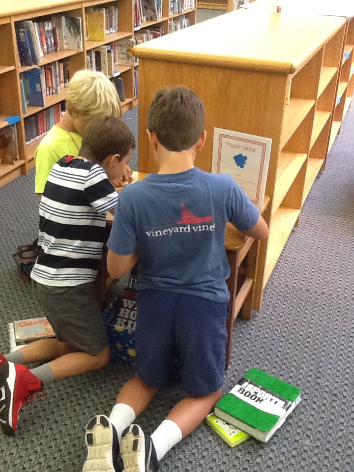 It is hard to believe that this is already the third week of school! Our library checkouts started up today and we were so thrilled to notice lots of excited students making their way to the desk. We also began a few “centers” in the library. We are starting with three: a puzzle center, an ABC table art center, and an independent reading center. We plan to add to these each month and keep them changing so you always have something new to try at the end of library class. What do you think so far? These fifth grade boys were really into the presidents puzzle that is out right now!