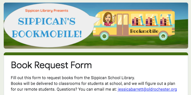 Welcome back, everyone! I know the staff at school are all excited to see you. Things might look a little different this fall but we are ready to be flexible! One new and exciting thing in the library is our Bookmobile. All students (even remote!) are able to request library books – at any time – and we will deliver them. Fill out the Google Form below any time that you’d like to request a book. Not sure what book you’d like to read? That’s okay! If you tell us what you’re in the mood for we can give you suggestions!