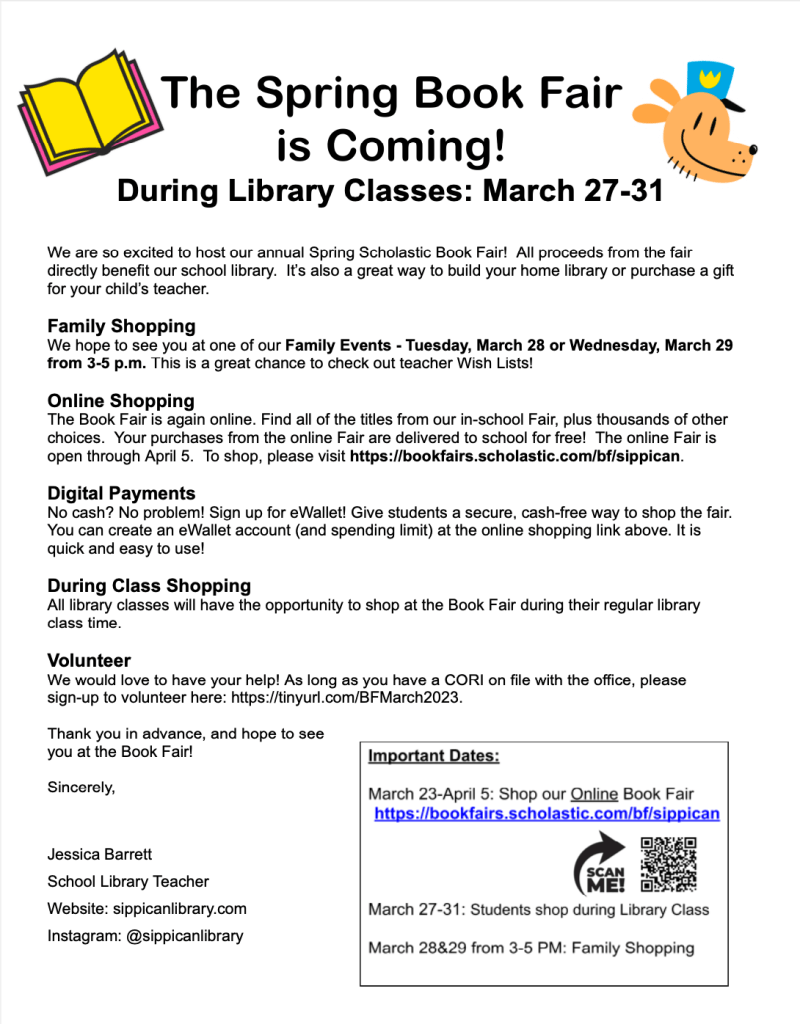 We are so excited to host our annual Spring Scholastic Book Fair! The Fair will run from March 27-31, with a preview day on March 24. At the Preview, students can make wish lists to bring home, showing you all of the books they are excited about from the fair. All proceeds from the fair directly benefit our school library. It’s also a great way to build your home library or purchase a gift for your child’s teacher!
